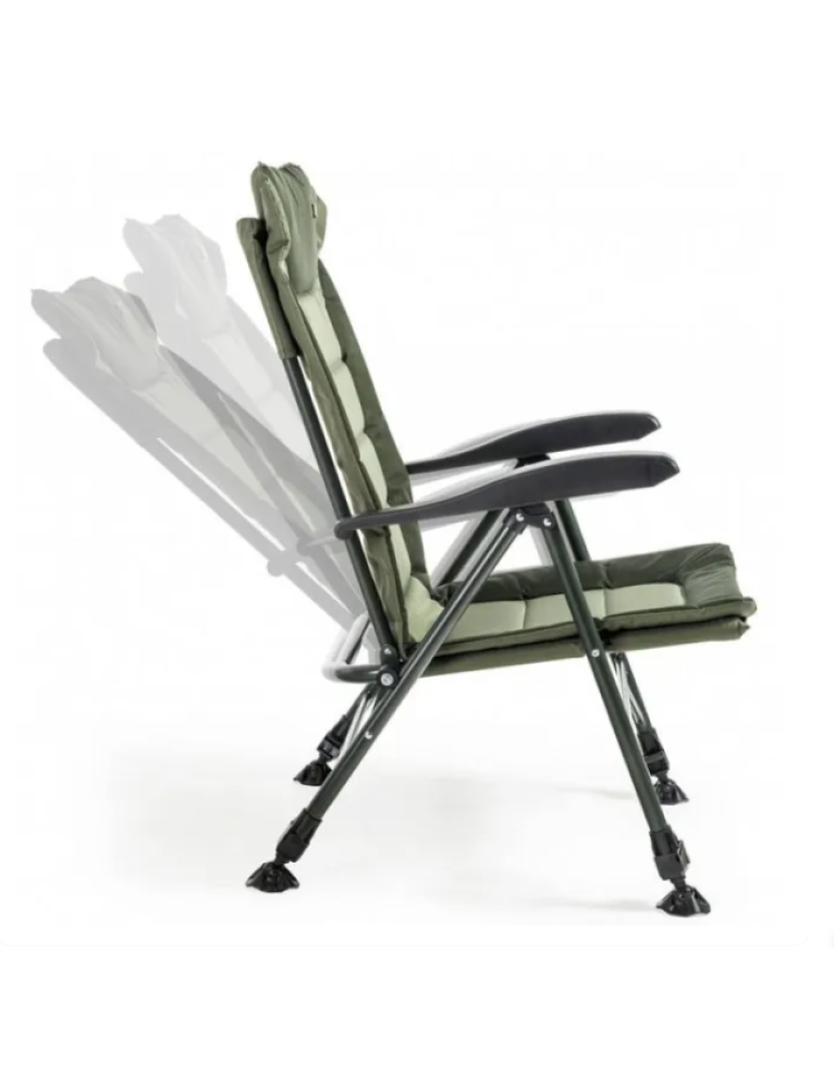 Picioarele telescopice reglabile cu talpici anti-alunecare asigură o stabilitate de neschimbat pe orice teren. Sistemul inteligent de plicare rapidă prin ridicarea suporturilor pentru antebrațe – care culisează fără efort pe un sistem cu role – și perna integrată pe tot profilul îl fac un companion ideal pentru pescuitul activ. Se pliază compact într-un volum mic pentru transport ușor.